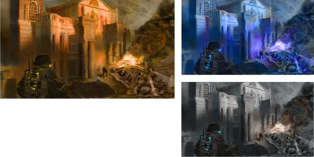 The next three paintings were done to come up with a monochromatic painting that conveys the different values and temperatures the best. I chose the orange one, as it worked well together with the fire and smoke.
