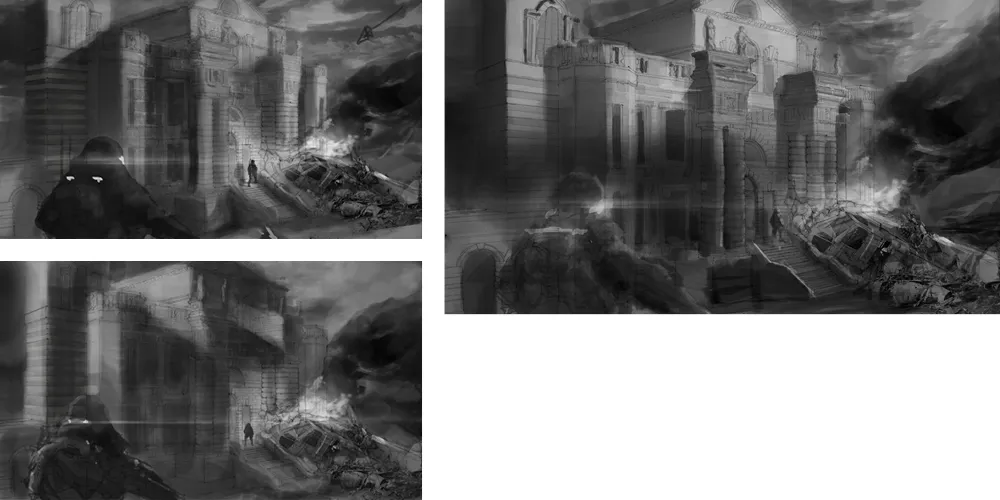 The three images below are some value studies that I did after the line work was finished. I chose the one painting where the upper half of the building is bathed in light as itlooks the most realistic and provides the most dramatic lighting scenario.