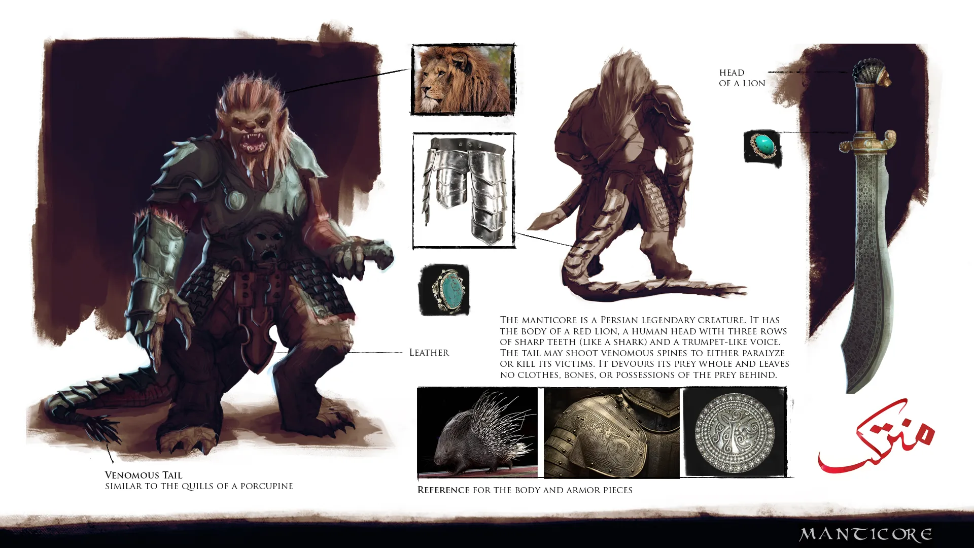 Our final assignment, a character or environment inspired by a mythological story. I chose the Manticore and created a character design sheet. The Manticore is a Persian legendary creature. It has the body of a lion and a head of a human with three rows of teeth. I took a different spin on it and drew him standing up.