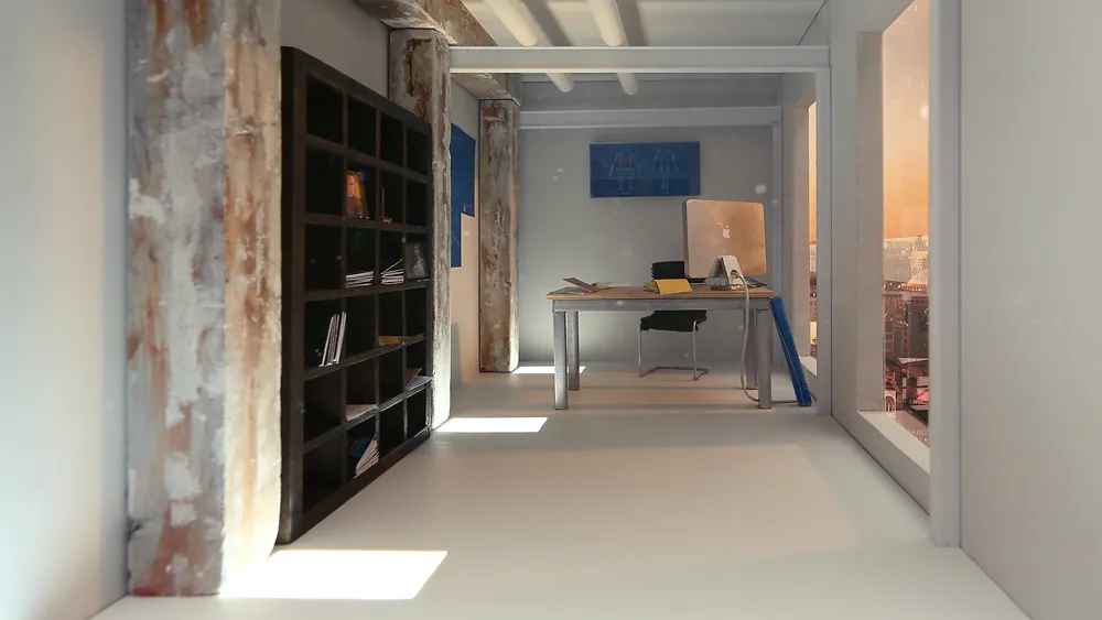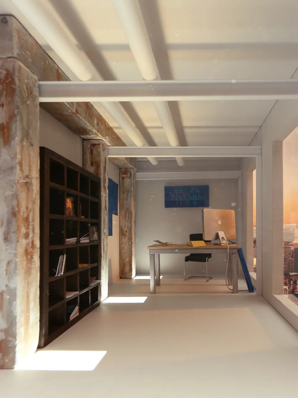 For the 3D Design class at Ringling College I created a miniature room (1:12 scale). This room was once an old factory that got reclaimed and transformed into a modern office. Some old elements, such as the concrete pillars were kept to create an interesting visual contrast to the new elements. Rumors have it, that this is Cave Johnson’s office where he first designed technology for Aperture Science.